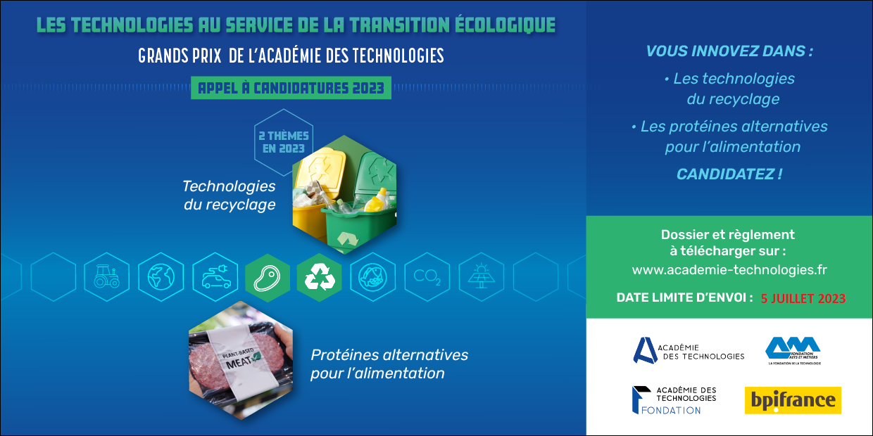 Vous êtes une startup créée depuis moins de 8 ans ? Votre entreprise est porteuse d’innovation technologique dans le domaine du recyclage ou dans celui des protéines alternatives pour l’alimentation ? Candidatez, à partir du 30 mars et avant le 30 juin 2023 minuit, aux Grands Prix de l’Académie des technologies !