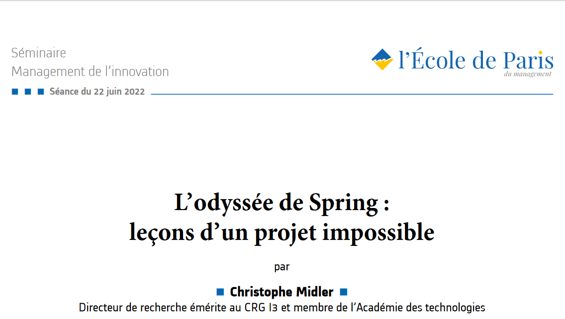 Le compte-rendu de cette intervention, rédigé par Erik Unger, est disponible sur le site de l’École de Paris du management : https://www.ecole.org/fr/seance/1516-lodyssee-de-spring-lecons-dun-projet-impossible