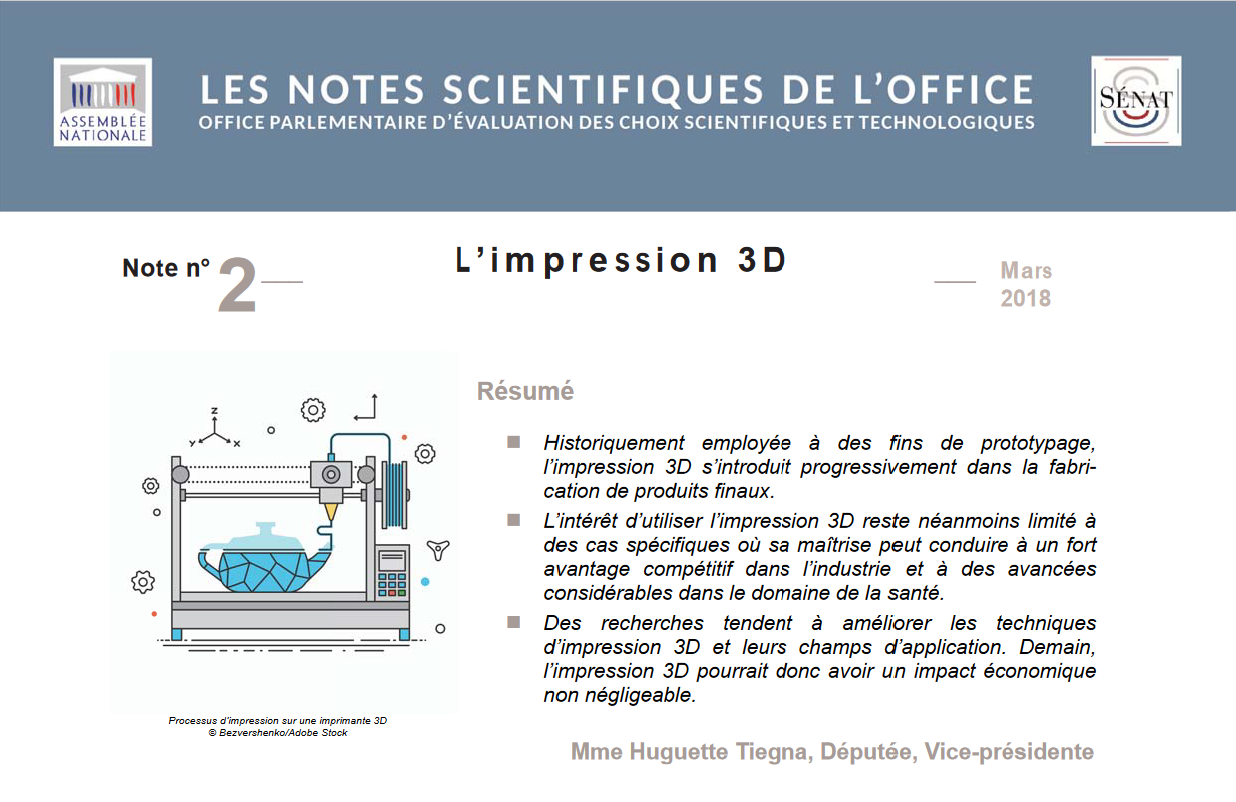 La note de l’OPECST sur l’impression 3D (n°2) (rapporteure : Huguette Tiegna, députée), présente en quatre pages un état de l’art synthétique sur cette technologie qui pourrait avoir demain un impact économique non négligeable.
